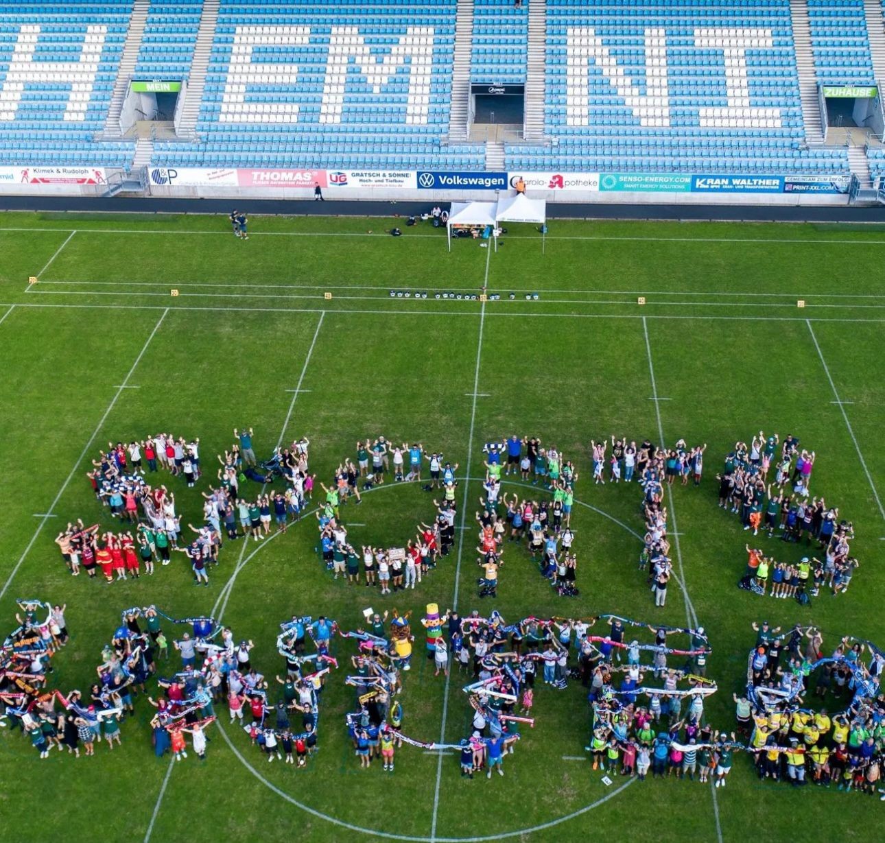The highlight of the day was planned for late afternoon. The "SPORTS UNITED" lettering, formed with the help of many people, was to be created on the grass inside the stadium. I helped to put the many people in the right position, the individual letters had to be "filled" with people. We all managed it together and the result was a great photo!