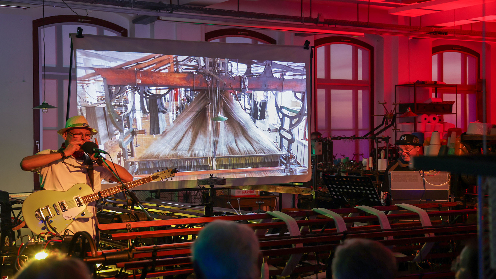 Sound recordings of weaving machines are used to create an acoustic experience in our Jacquard weaving workshop. Combined with musical elements from rock and blues, you will experience a work of sound that is complemented by a light animation.