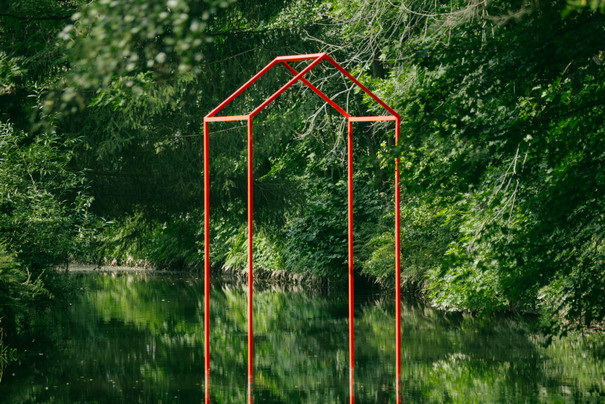 The sculpture My Floating Home by Karolin Schwab is installed in the Mühlgraben, a diversion ditch of the river Zschopau. The work, made of red powder-coated square tubes, is reminiscent of a fleeting, three-dimensional sketch of a house. With this work, the artist explores the question of what it means to be at home. Changing images are created in the water over the course of the seasons. Carolin Schwab was born in Stralsund, Germany, in 1987. She now lives and works in Berlin, Germany.