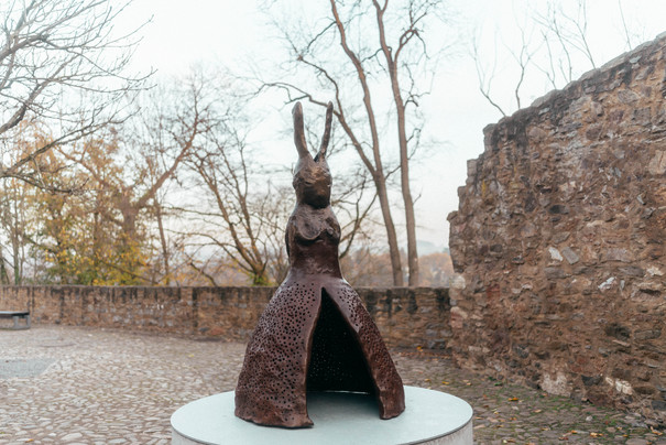 The sculpture Usagi Greeting by artist Leiko Ikemura depicts a hare (jap.: Usagi) in the style of Buddhist and Christian iconography. The bell-shaped lower part reveals a miniature firmament through which light shimmers. Ikemura‘s work symbolises fertility, renewal and the fluid boundary between humans, animals and plants. The placement refers to the castle’s Asian collection. Leiko Ikemura was born in Tsu, Japan, in 1951. She now lives and works in Berlin, Germany.