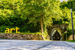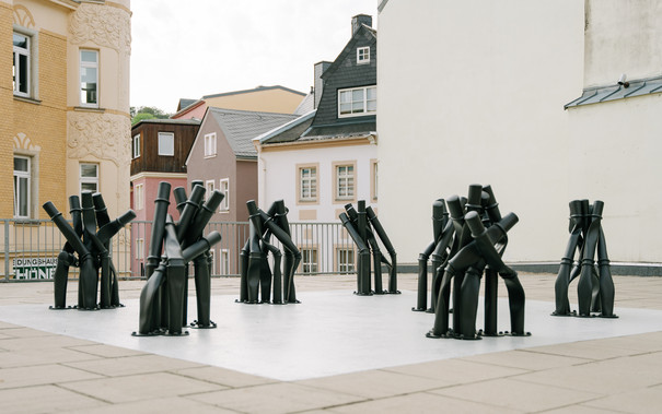 The sculpture 42 days by German-Iranian sculptor Bettina Pousttchi comprises 42 objects made of powder-coated steel that are reminiscent of bent street bollards. They resemble people resisting the pressures and challenges of a fast-paced industrialised society. The work refers to the "Free Republic" of Schwarzenberg, which was unoccupied for 42 days after the Second World War. Bettina Pousttchi was born in Mainz in 1971. She now lives and works in Berlin.