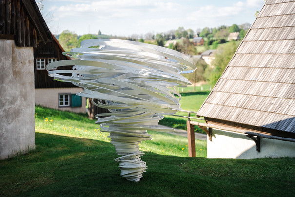 The sculpture Twister Again by Alice Aycock is located in the Seiffen Open-Air Museum. Aluminium strips wind concentrically upwards in a dynamic vortex. They seem to drift apart chaotically. Various shapes can be recognised, like the whirling of wood shavings during woodturning. Alice Aycock was born in 1965 in Harrisburg, USA. She now lives and works in New York.