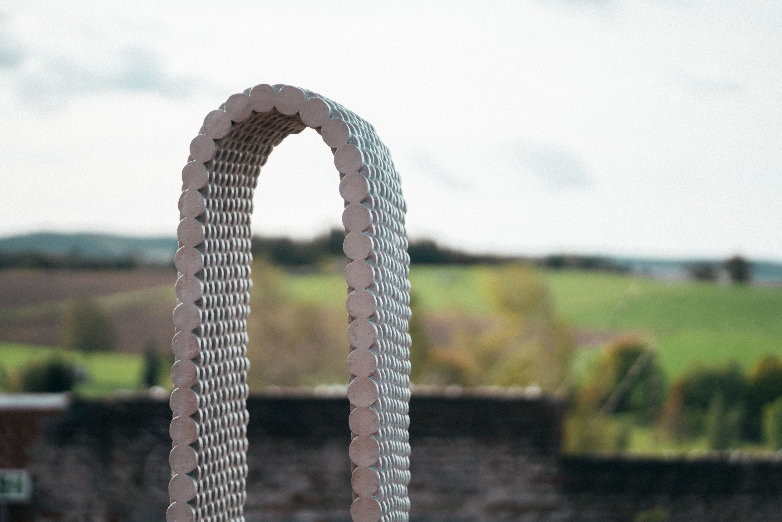 The sculpture Bogen by artist Leunora Salihu stands on the former dog track of the former Hoheneck women‘s prison. Hundreds of circular aluminium discs form a narrow gate two metres high. It invites you to walk through it, to observe the changing shadows cast by the daylight, but also to reflect on the history of the site. Leunora Salihu was born in 1977 in Pristina in Kosovo. She now lives and works in Düsseldorf, Germany.
