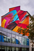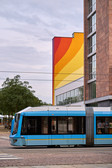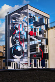 Claudia Walde aka MadC kicked off the residency programme in February 2024 with her abstract painting Tgif. The artist and author studied at Burg Giebichenstein in Halle and at Central Saint Martins College in London. Walde is currently one of the world's best-known graffiti artists. Her works can be found in Europe, South Africa, Mexico, Hong Kong and the USA. The mural on Johannisplatz is based on a series of canvases that will be presented at the HALLENKUNST exhibition. On the neighbouring wall is a robot model made from 3D software by Jonas Bond aka Bond Truluv. Visitors have the best view of the mural entitled CLOUD XP from Johannisplatz, near the entrance to the former Borssenanger Gallery. Czech artist Jan Kaláb has created a colourful mural on the opposite side. The curved stripes, which change from purple to red and yellow, run along the façade.