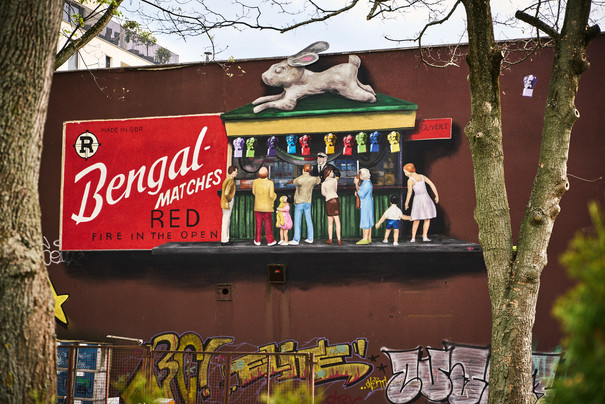 Tucked away between restaurants, a supermarket and a pub on a low-rise building on Getreidemarkt is the newly created mural by the Berlin artists' collective NIZA. They have created a mural made of matchboxes and figures on the former craftsmen's yard.