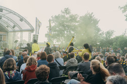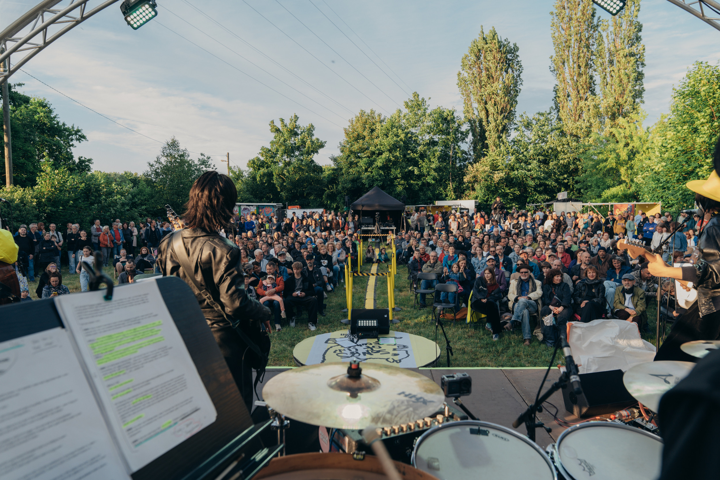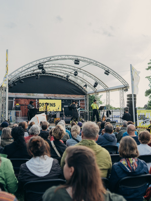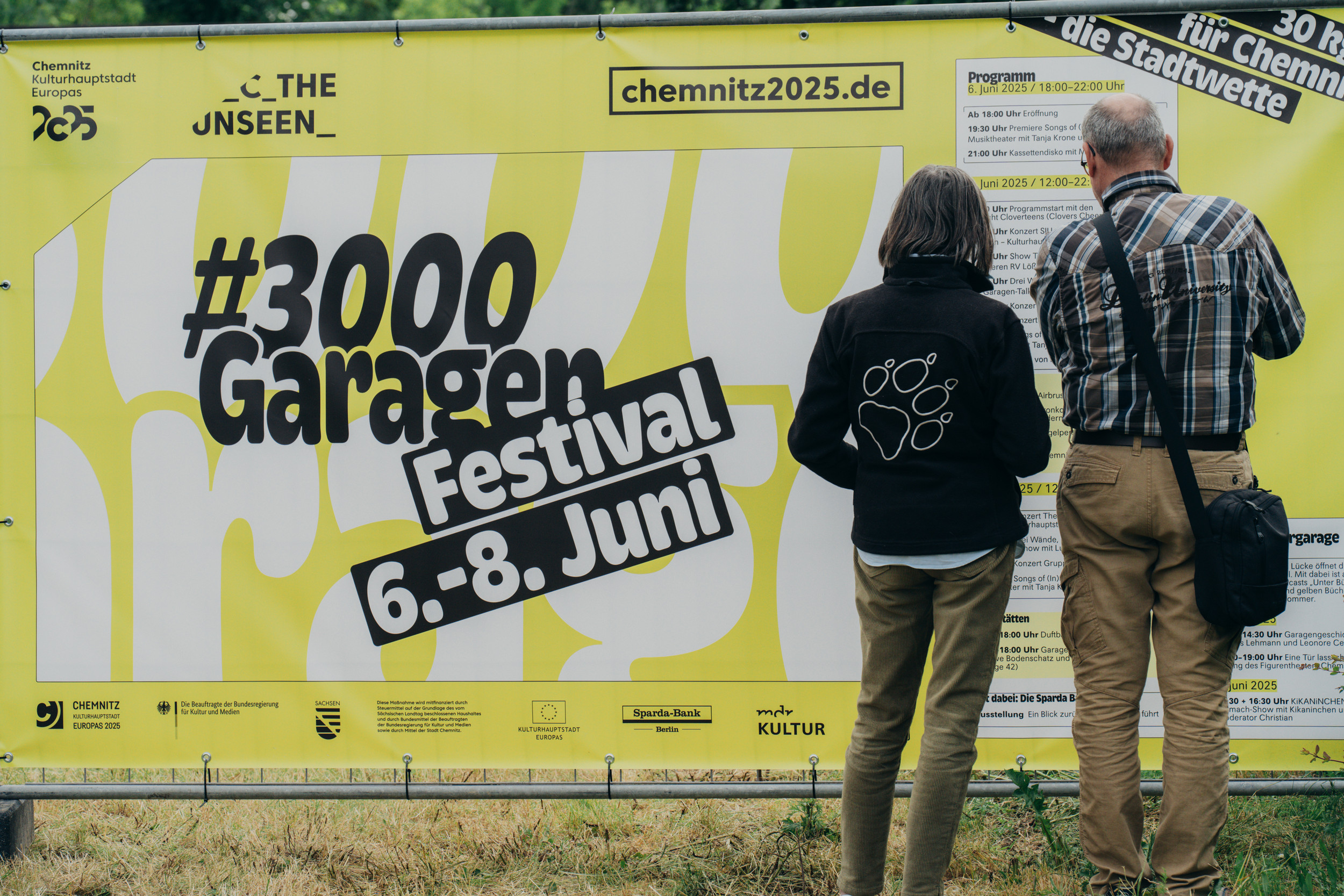 Umrahmt von fast 1.000 Garagen liegt eine Wiese. Sie war die Spielstätte für ein Fest, das ganz im Zeichen der Garagenkultur stand. Das Programm fand unter aktiver Beteiligung von Garagennutzer:innen statt und hangelte sich entlang ihrer Biografien, Hobbys und Fertigkeiten – sei es mit Konzerten, Talkshow oder einer 30 Kilo Senfwette. Die Abende gehörten der Künstlerin Tanja Krone und ihrem Team, die das Musiktheater SONGS OF (IN)SECURITY – die erste Sicherheitskonferenz des ehemaligen Ostens - aufführten.