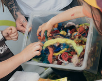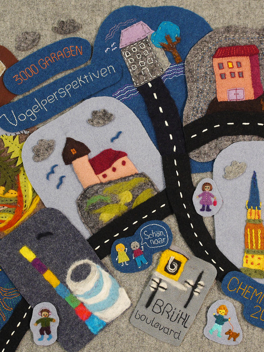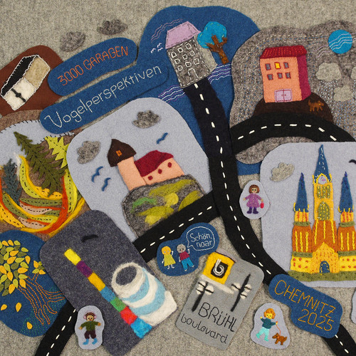 Jede:r erlebt Chemnitz anders. Die Stadt wird wahrgenommen durch Menschen und ihre täglichen Wege, durch Natur und Architektur, durch Erinnerungen an andere Städte oder Heimatorte. Diese Wahrnehmungen der Stadt brachten zwei Frauen gemeinsam mit Menschen, die Lust darauf hatten, in eine textile Form: Sabine Hochmuth, die Besucher:innen zur gemeinsamen Handarbeit in ihre Wollgarage einlud, und die in Berlin lebende finnische Künstlerin Kati Hyyppä. In Mitmach-Workshops, entstanden reale und imaginäre Objekte und Landschaften aus Filz und Stickerei. Sie wurden zu einem großen Teppich zusammengenäht, der Chemnitz aus der Vogelperspektive zeigte und die Vielfalt der (Kulturhaupt-)Stadt widerspiegelte.