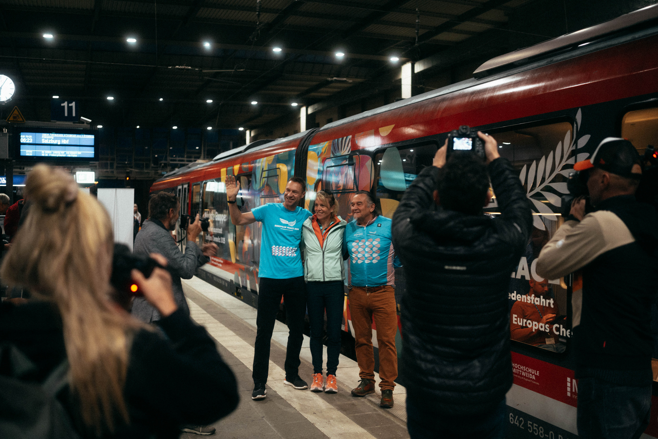 Der European Peace Ride ist ein Projekt, das verbindet: Am zweiten Tag ging es weiter nach Plzeň, die letzte Etappe führte über den Erzgebirgskamm zurück nach Chemnitz. Auf den letzten Kilometern schlossen sich zahlreiche Chemnitzer:innen dem Peloton an, bis es im Eissportzentrum Chemnitz über die Ziellinie ging.