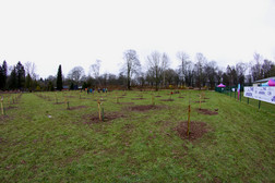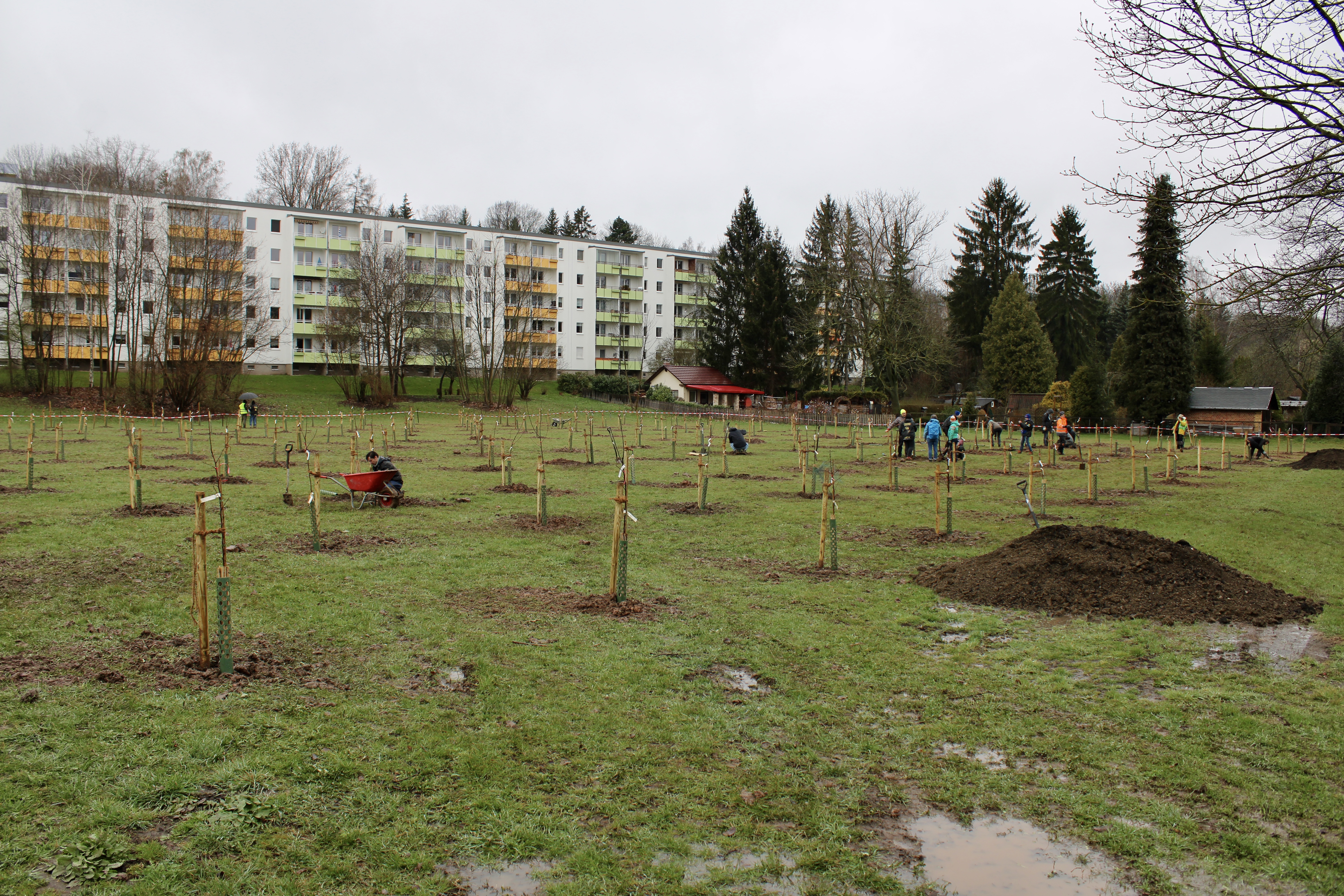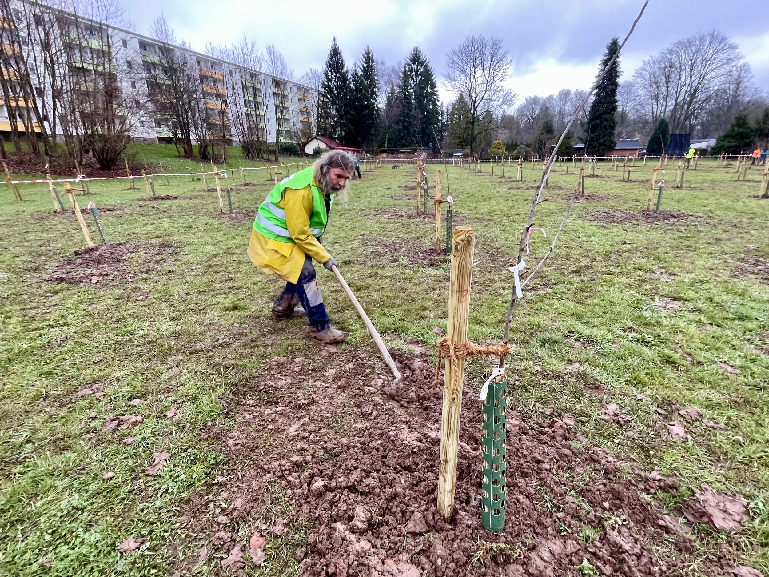 Das Team der „Gelebten Nachbarschaft" hatte am 31.3.25 zum „Aufbruch" Pflanzfestival am Stadtpark eingeladen, einer Pflanzaktion für alle Menschen, die gerne ein Apfelbäumchen pflanzen möchten. An diesem Tag war Petrus uns mit dem Wetter leider nicht wohlgesonnen, es schüttete entweder aus Eimern oder nieselte so dahin. Das Team der “Gelebten Nachbarschaft” rechnete damit, dass vielleicht 40 Bäume eingepflanzt würden ob des Wetters. Mein Einsatz begann 16.00 Uhr und Projektkoordinatorin Tina Langklotz sagte:” Du kannst noch einen der letzten beiden Bäume mit einpflanzen, dann sind wir fertig.” Ich erfuhr, dass kurz nach der Eröffnung Gruppen von Volkswagen und der Deutschen Post bzw. Volunteers schon sehr fleißig am Werk gewesen waren. Wow!!! Chemnitz!!!