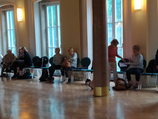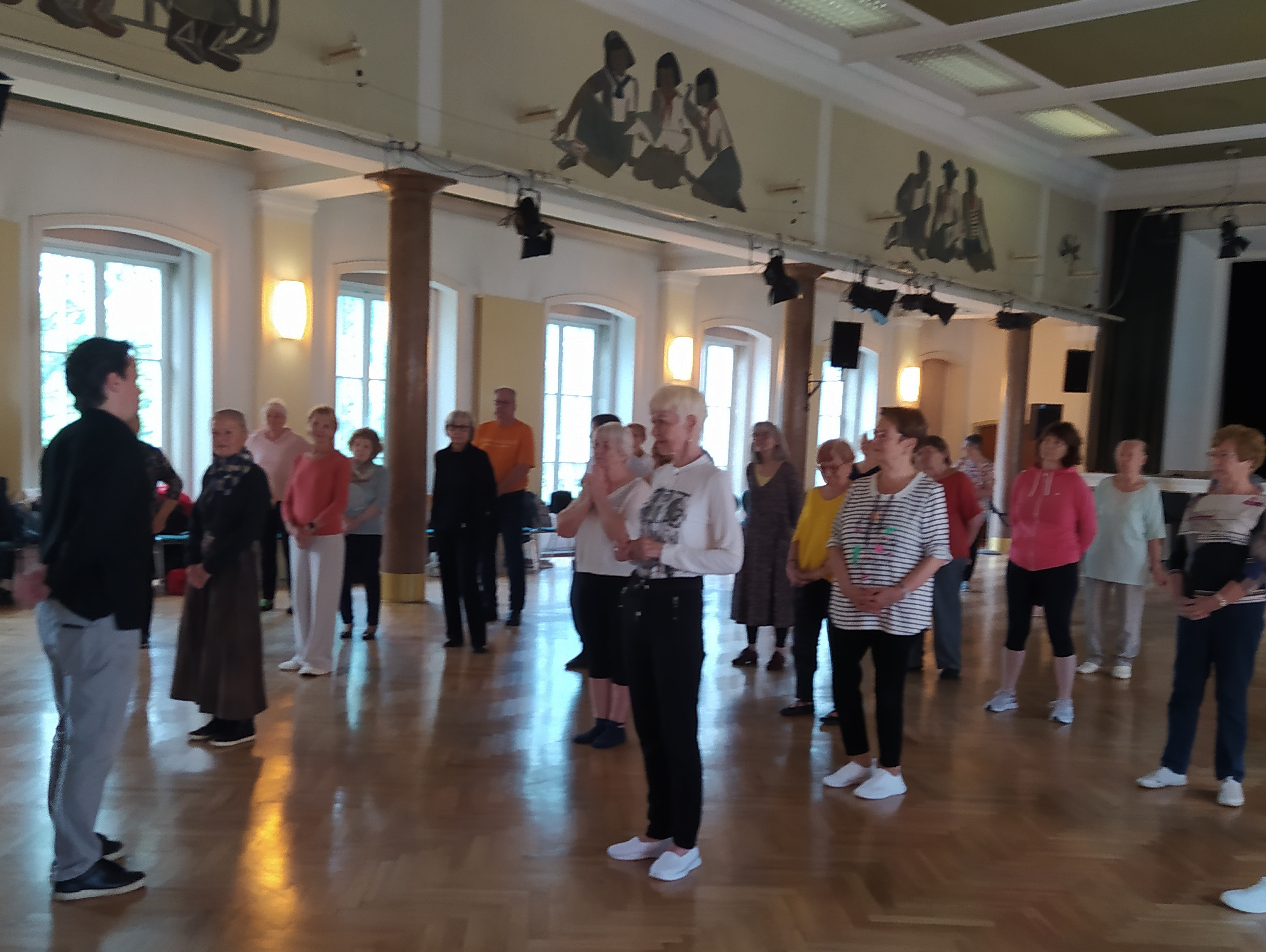 Die Gruppe hatte Aufstellung genommen. Aus der Konserve kam die passende Musik. Die TeilnehmerInnen setzten die Anleitungen des Übungsleiters aufmerksam um. Nicht lange und es fielen die ersten Fachbegriffe wie Position 1, Position 2 usw. Das klang ja dann doch eher nach Ballett. Die Irritation hielt nicht lange an. Scherzhaft hatte Michal Sandor ja auch mehrfach gesagt, dass es hier nicht um Spagat gehe. Der weitere Verlauf der geplanten zwei Stunden brachte wie versprochen gemeinsame Bewegung – nicht mehr und nicht weniger.