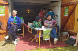 Am Stand „Vogelperspektiven“ lud die „Wollbine“ Frau Sabine Hochmuth zum Mitmachen ein. Seit 2024 entsteht in verschiedenen Workshops und bei anderen Gelegenheiten - wie eben auch beim Festival auf dem Harthweg - ein großer Wandteppich. Viele Silhouetten bekannter Gebäude der Stadt Chemnitz wurden bereits aus Filz gefertigt. Auf einer textilen „Stadtkarte“ werden diese von Frau Hochmuth platziert. (Siehe beigefügtes Foto) Ab dem 18. Oktober 2025 wird der Teppich im Garagencampus zu bewundern sein.