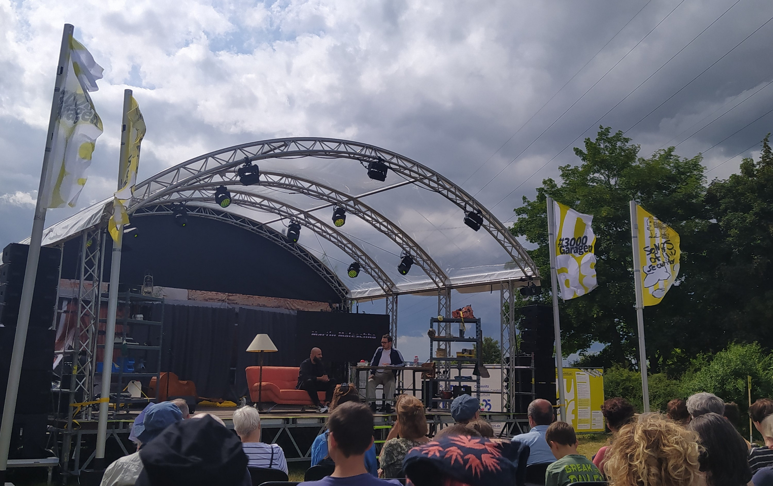 Die Garagenzeile hinter der großen Bühne war zu einer kleinen Erlebnismeile geworden. Vor der „Literaturgarage“ nahmen große und kleine Besucher Platz, um Garagengeschichten der Autorin Leonore Cebulla zu hören. Marcus Lehmann las sein preisgekröntes Chemnitzmärchen. Ort der Handlung? Natürlich eine Garage! „Kikaninchen“ vom Fernsehen gab sich die Ehre, MDR Kultur war vertreten, Mitarbeiter der Sparda-Bank, einer der vielen Sponsoren der Kulturhauptstadt, standen für Gespräche mit Gästen zur Verfügung.