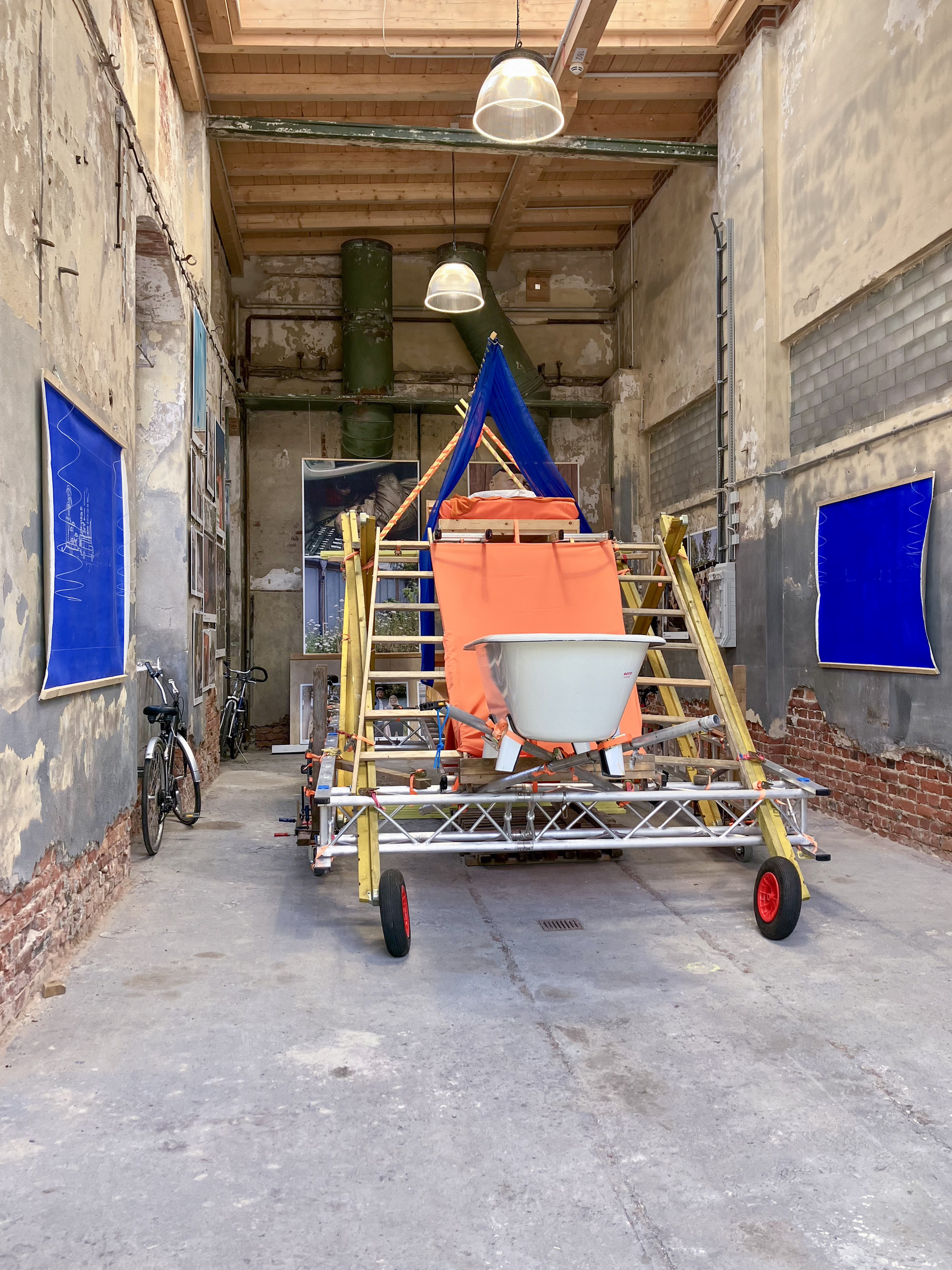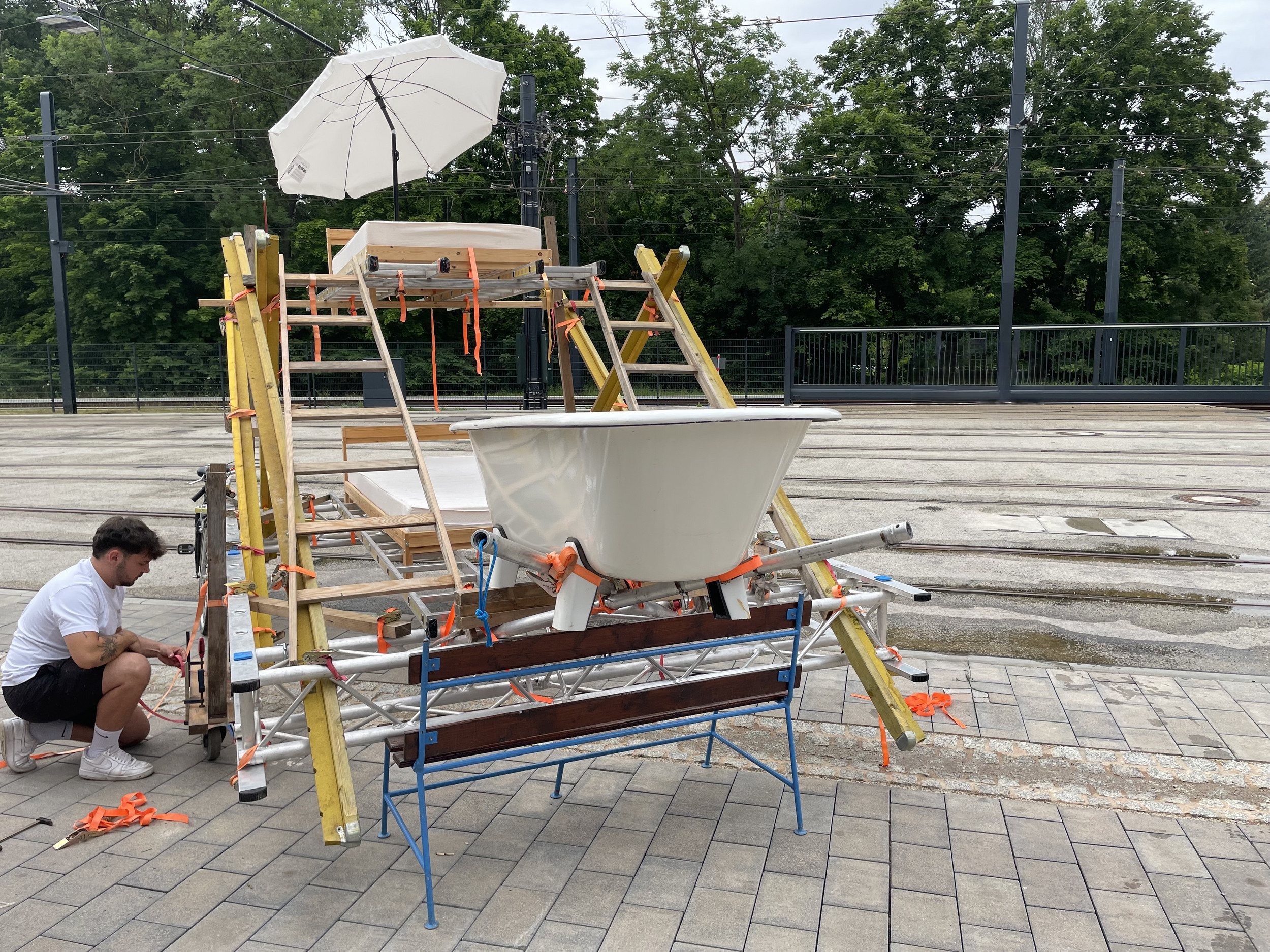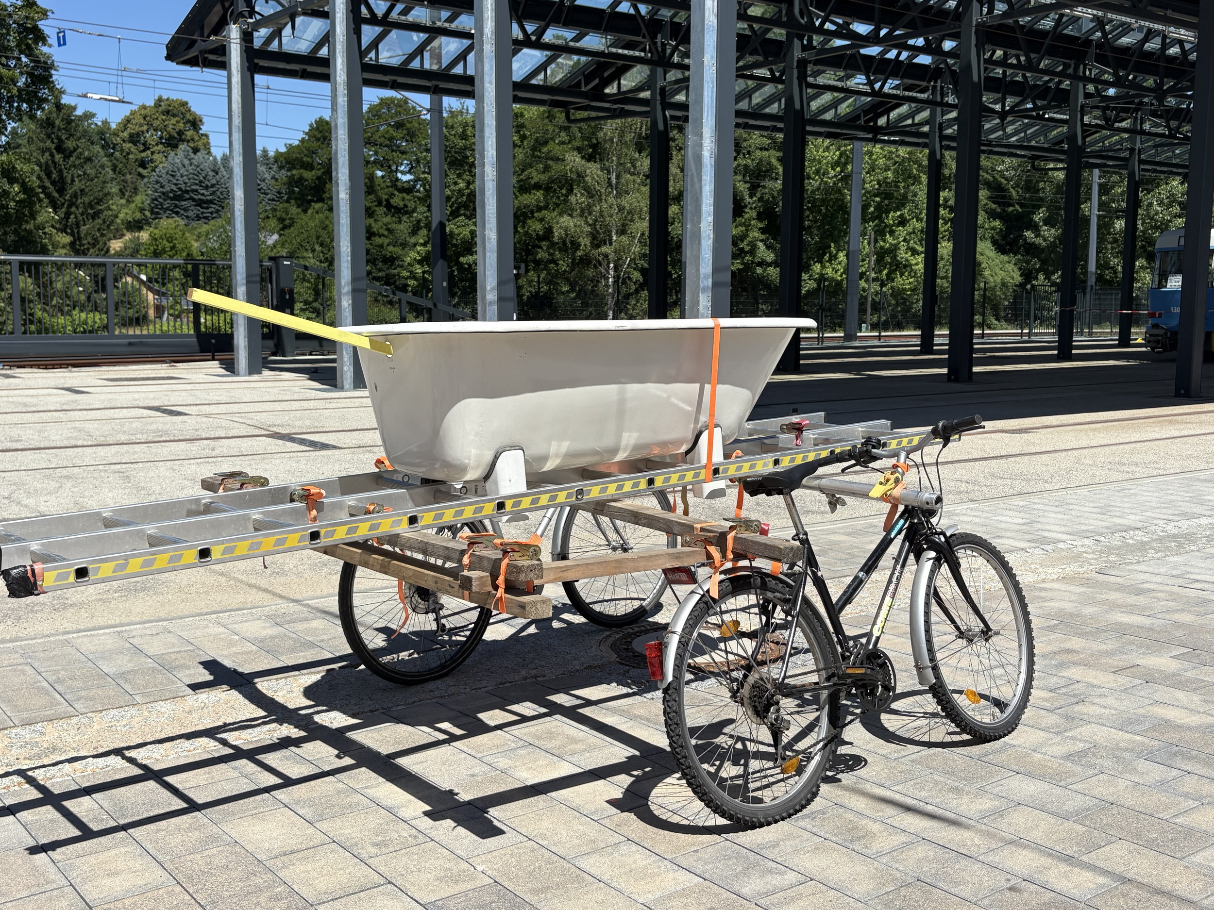 Gerade durch das praktische Ausprobieren und gemeinsame Tüfteln entstanden fantasievolle, unerwartete Fahrzeuge: eine fahrende Badewanne, befestigt auf einer Leiter und angetrieben von zwei Fahrrädern; rollende Stühle auf Holzbrettern; oder ein besonders bequemes „Auto“ in Form eines Bettes – eingebettet zwischen Gerüstteilen und Leitern.
