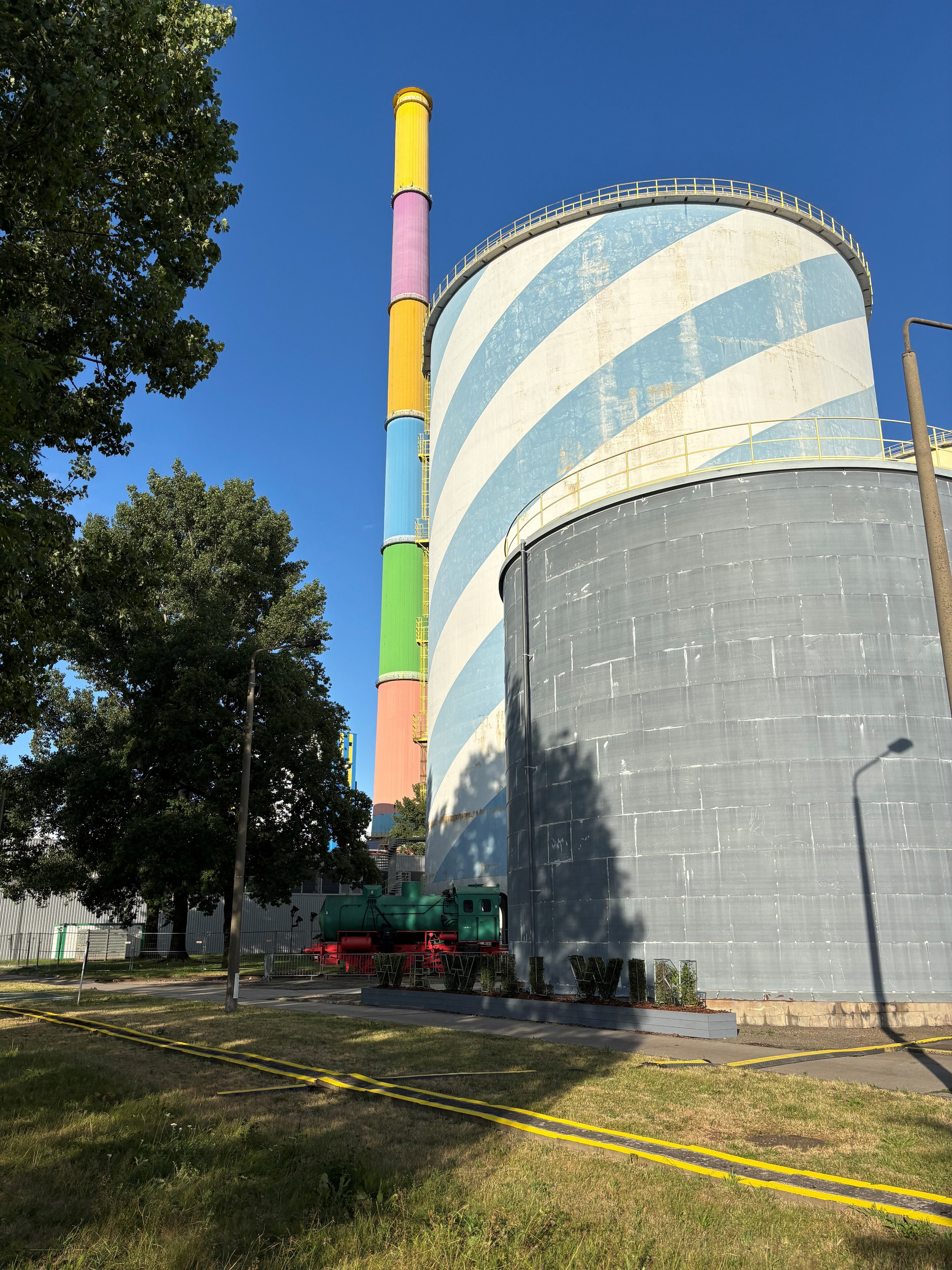 Das Kunstfestival „Begehungen“ ist nicht neu in Chemnitz, sondern bereits die 22. Ausgabe. In diesem Jahr, im Kulturhauptstadtjahr, aber besonders groß und an einem sehr bekannten und interessanten Ort der Stadt, im Heizkraftwerk Nord, zu finden. Am Fuße der bunten Esse, eines der Wahrzeichen von Chemnitz. Das Heizkraftwerk hat erst vor einem Jahr, nach dem Ende der Braunkohlenförderung, seinen Betrieb eingestellt. Ich war nicht nur auf die Ausstellungsstücke gespannt, sondern auch darauf, dieses in der Vergangenheit für die Außenwelt abgesperrte Gelände mit seinen riesigen Kühltürmen betreten zu dürfen.