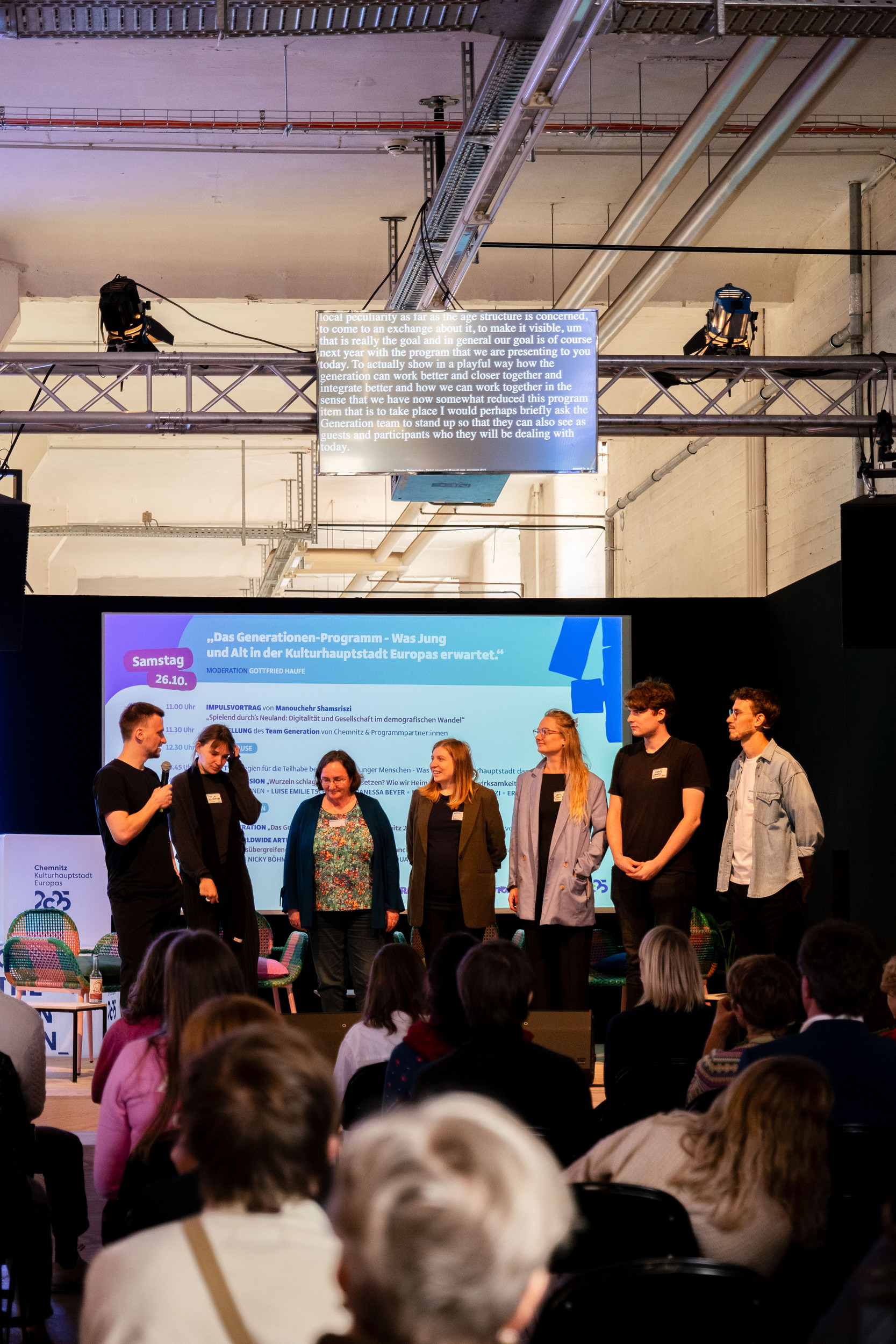 Im weiteren Verlauf präsentierte das Team Generation sein Programm mit 18 intergenerationellen Projekten. In einer Projektgalerie hatten die Akteur:innen die Möglichkeit, ihre Vorhaben direkt mit den Besucher:innen zu diskutieren. Parallel kamen 30 Jugendliche aus acht Ländern zusammen, um sich über ihre Perspektiven auf Europa und Jugendbeteiligungsformate auszutauschen.