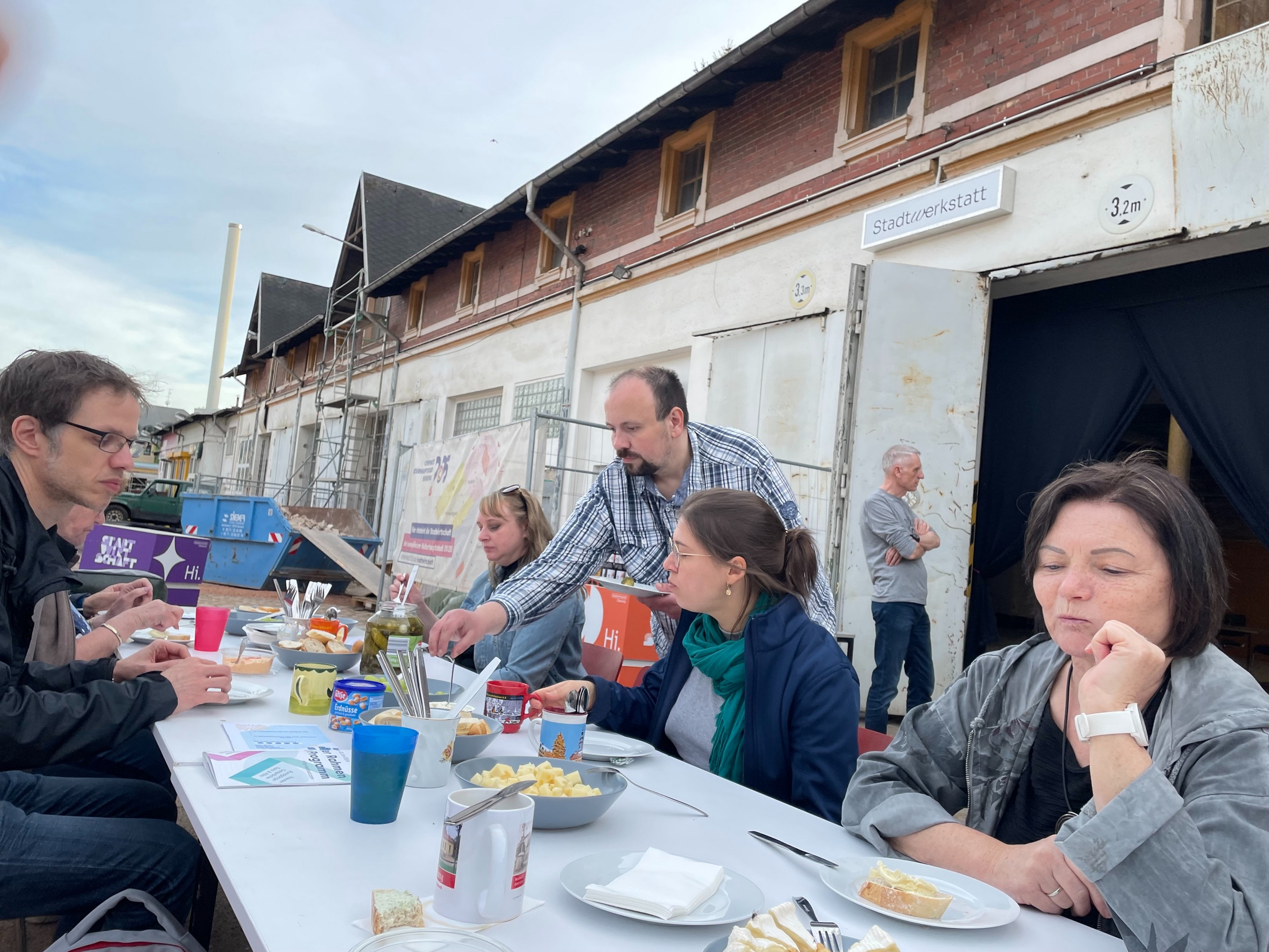 Zum Abschluss genießen wir die besondere Atmosphäre des zukünftigen Hofes und lassen den Tag bei einem von den Stadtteilpiloten liebevoll zubereiteten Imbiss ausklingen. Unsere Gespräche erwecken die besuchten Stationen wieder zum Leben, unser Respekt gilt all jenen Akteuren, die sich für ihre Sache und ihre Mitmenschen einsetzen. Dankeschön!