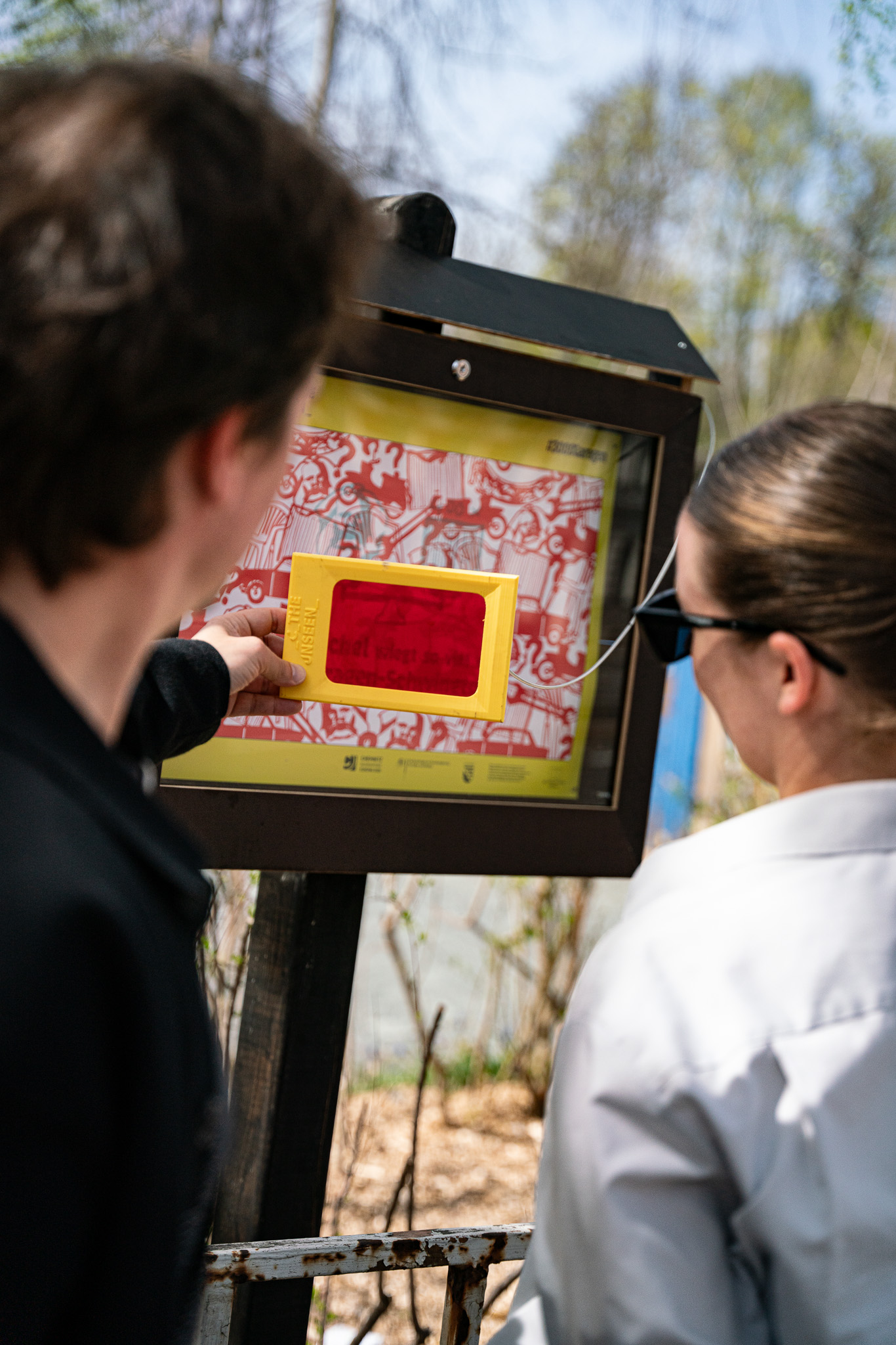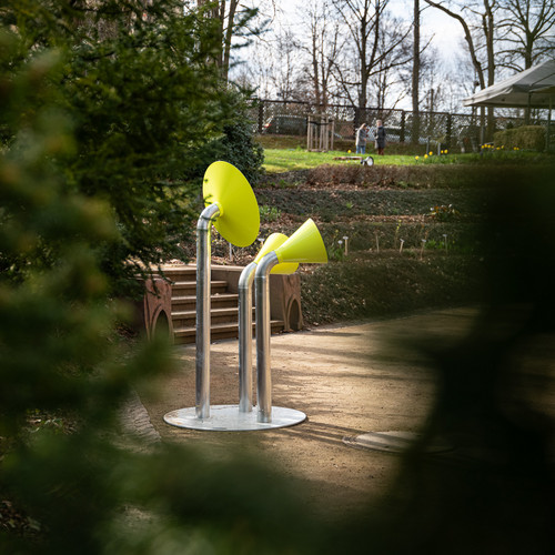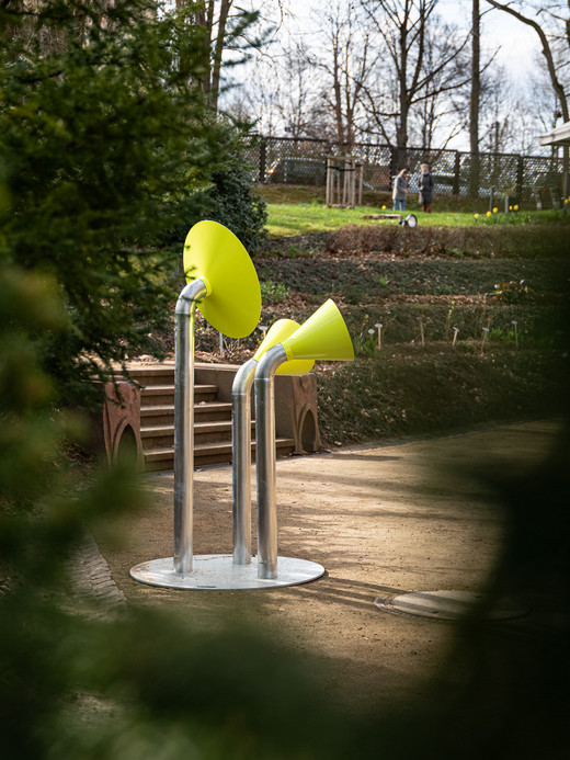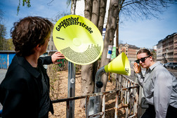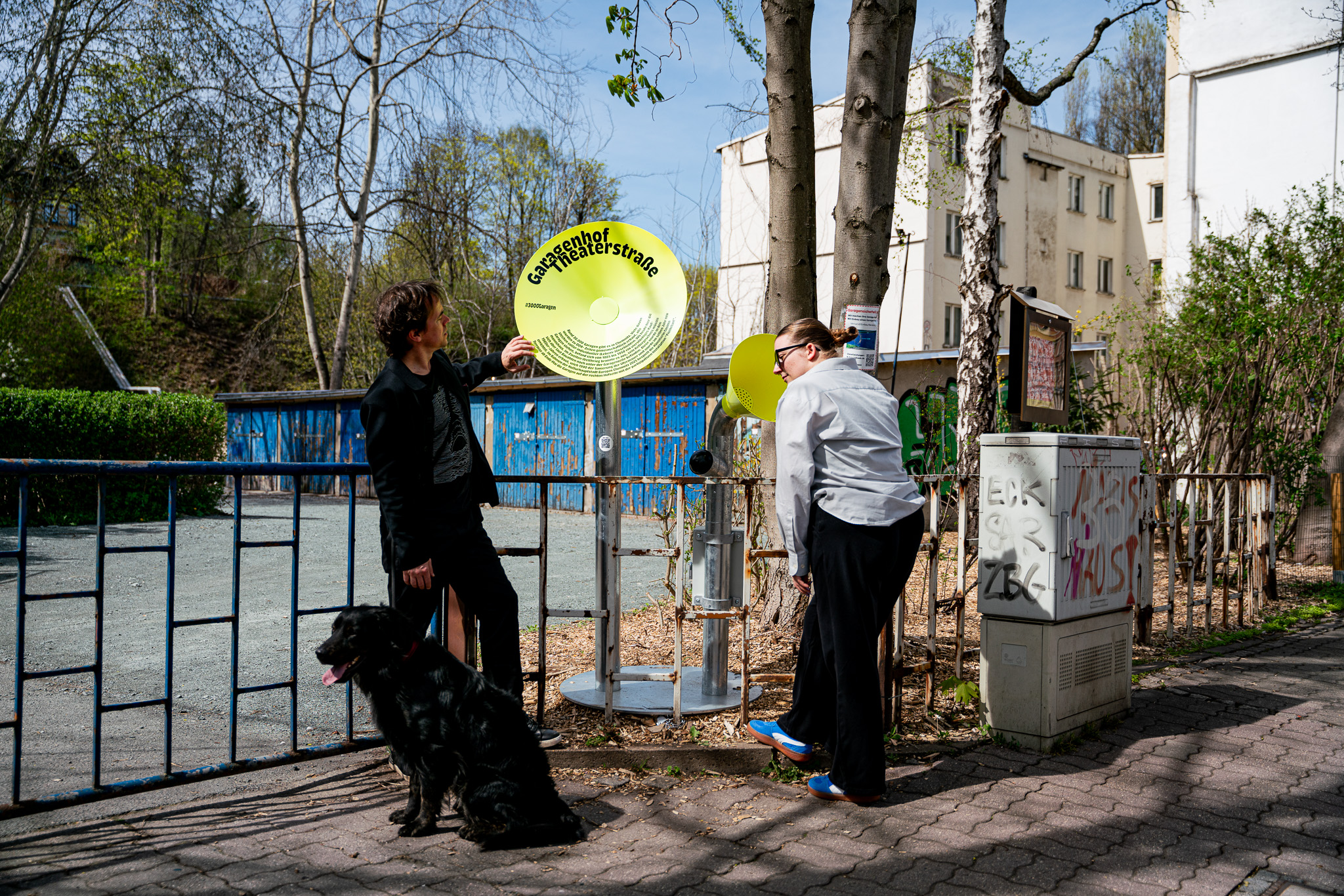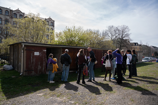 Mit einem Spaziergang entlang des Garagen-Parcours erkundeten Bewohner:innen und Gäste Chemnitz auf eigene Faust. Sie flanierten über den Garagenhof, schauten über den Zaun, fanden Geschichten vor Ort und kamen mit ihren Mitmenschen ins Gespräch. An den 10 Standorten standen knallgelbe trichterförmige Infostationen, gestaltet von angehenden Designer:innen der Burg Giebichenstein Kunsthochschule Halle. Diese präsentierten kleine Geschichten und kuriose Fakten.
