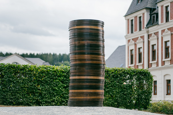 Sean Scullys Bronze-Skulptur Coin Stack 2 besteht aus 40 übereinander gestapelten braunfarbigen Scheiben, die an Münzen erinnern. Vor Ort vergegenwärtigen die Münzen symbolisch 1496 und 1498 erfolgreich geführte Arbeitskämpfe der Schneeberger Bergleute gegen die Lohnkürzung einer Münze pro Woche. Scully wurde 1945 im irischen Dublin geboren. Er lebt und arbeitet zwischen New York, Bayern, Aix-en-Provence und London.