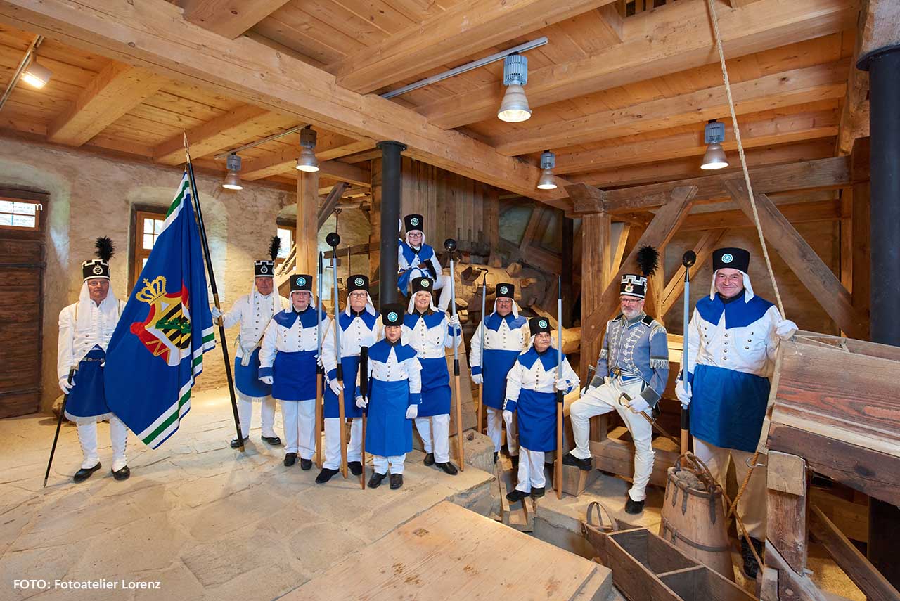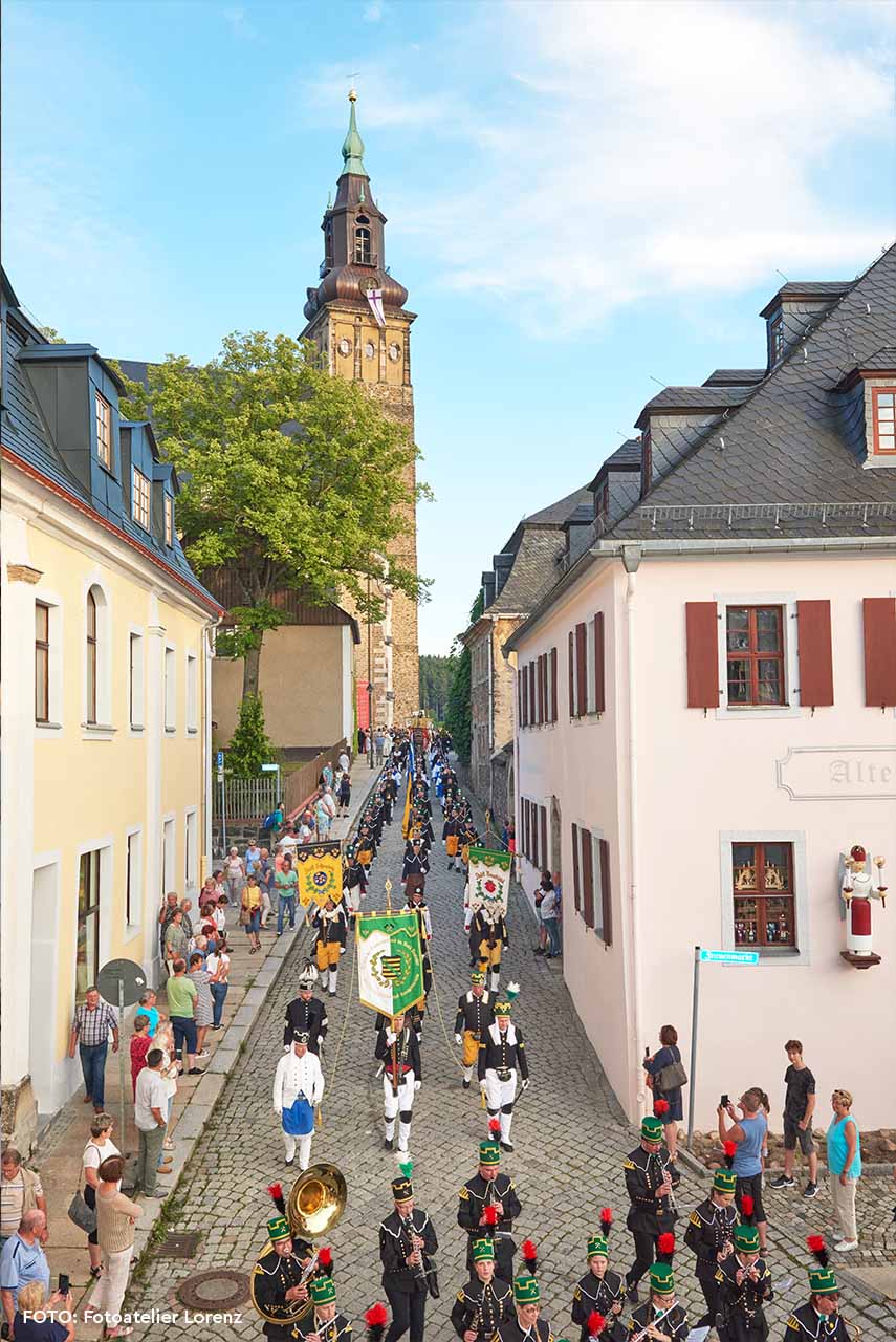 Erst die Arbeit, dann das Vergnügen: Noch vor der Gründung von Schneeberg 1471 findet 1453 ein Bergwerk „uff dem Sneberge“ urkundliche Erwähnung. Zunächst wird hier Zinn, Eisen und Kupfer abgebaut, doch 1470 wird in der Neuen Fundgrube Silber entdeckt – und der Schneeberg besiedelt. Noch heute liegt der Stadtkern von Schneeberg mit seinem hübschen Marktplatz und der historischen Innenstadt, nach einem Stadtbrand 1719 in barockem Stil auf alten Grundrissen wiedererrichtet, auf dem Berg. Er gehört heute zum UNESCO-Welterbe „Montanregion Erzgebirge / Krušnohoří“. Weithin sichtbar ist die vom Brand verschonte spätgotische St. Wolfgangskirche. Das historische Siebenschlehener Pochwerk und die alte Silberschmelzhütte St. Georgen, weltweit das älteste erhaltene Bauwerk seiner Art, bilden im Schneeberger Stadtteil Neustädtel ein Ensemble, das an die Zeit des Schneeberger Berggeschrey erinnert.
