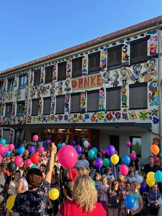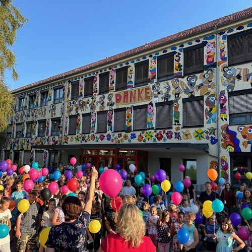 In einem kreativen Workshop arbeiteten die Schüler:innen, Lehrkräfte und zahlreihe engagierte Freiwillige gemeinsam mit dem Künstler Michael Fischer-Art an einem farbenfrohen Wandbild für die Schule. Unter dem Motto „Kreativität verbindet“ entstanden bunte, witzige Köpfe, die die Vielfalt und den Zusammenhalt der Schulgemeinschaft widerspiegeln. Mit viel Enthusiasmus und Teamgeist wurden zudem 14 positiv besetzte Schlagworte wie „Dialog“, „Lernen“, „Fairness“ und „Mitgefühl“ in das Kunstwerk integriert. Das Ergebnis war ein lebendiges Bild, das nicht nur die Wände schmückte, sondern auch die Herzen der Betrachter erfreute.