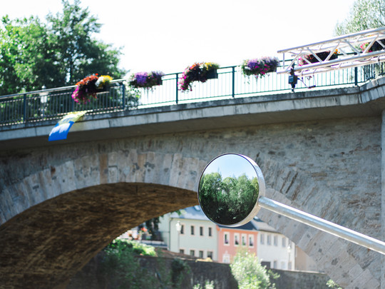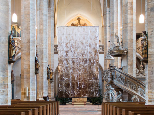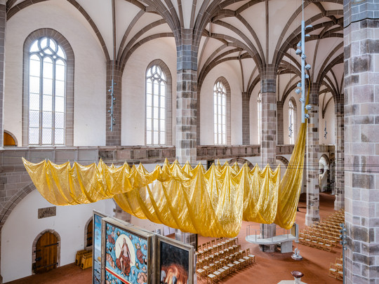 Werke von mehr als 60 Künstler:innen finden sich auf Industriebrachen, an Bahnhöfen, Flussufern oder im stillen Wasser eines Mühlgrabens. Sie korrespondieren mit Bauern- und Textilmuseen, verbinden sich mit Schlössern und alten Kirchen, ihren Orgeln und ihrer Kunst. Manchmal spielen sie auch in illustren Ecken und Winkeln UNESCO-geschützter Altstädte, die zu Kontextgebern wie vielstimmigen Erzählern erwähnter Geschichte werden.